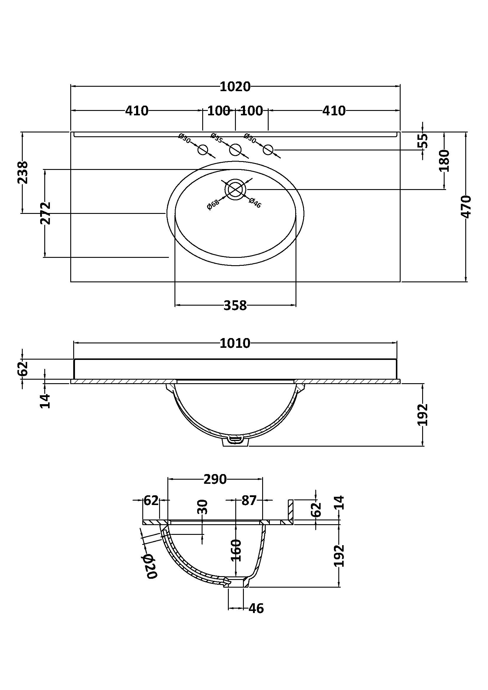 1000mm Rectangle Marble Top/Basin - 3 Tap Hole