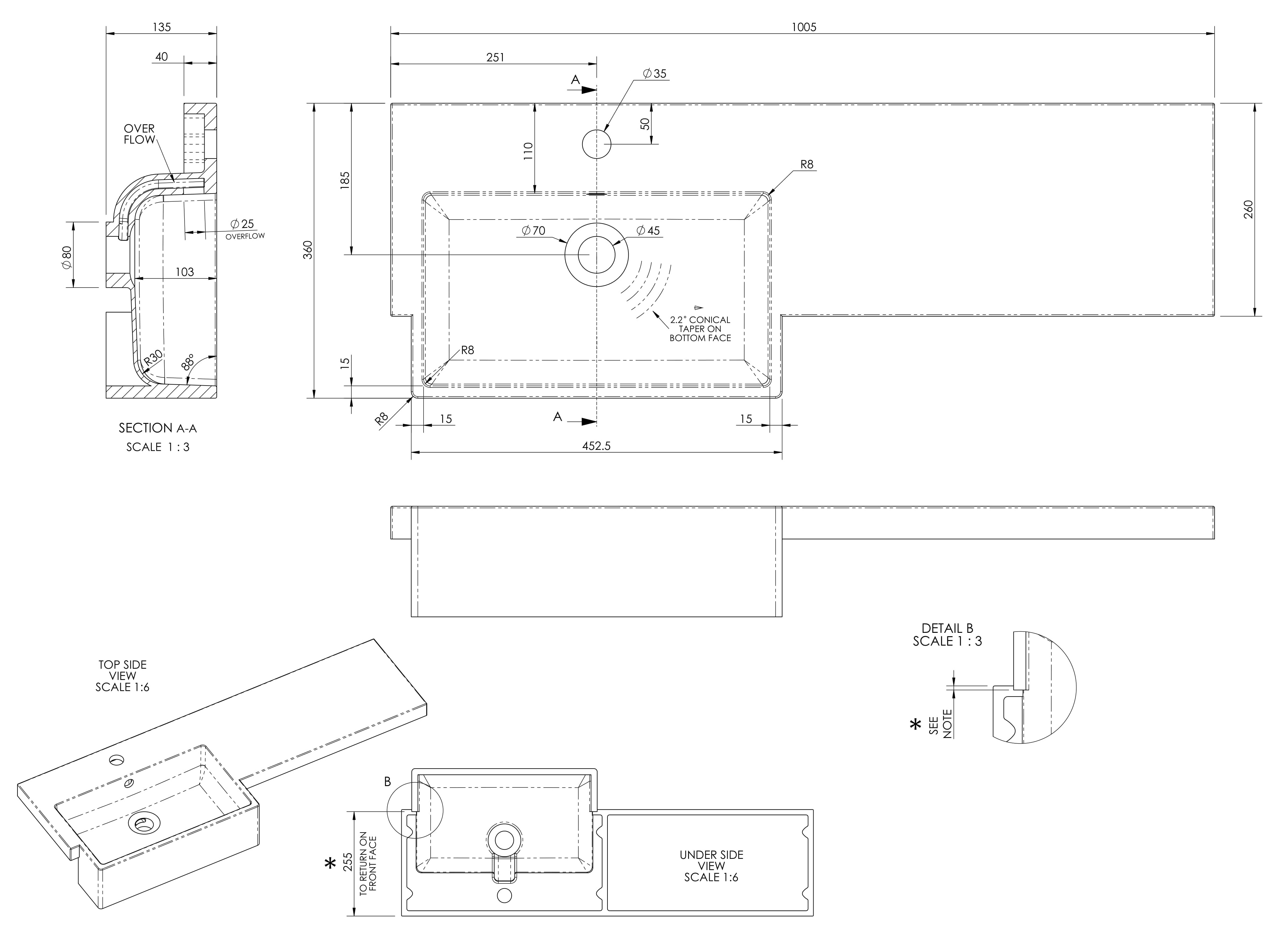 1000mm Square Semi-recessed Polymarble Basin - Left Hand