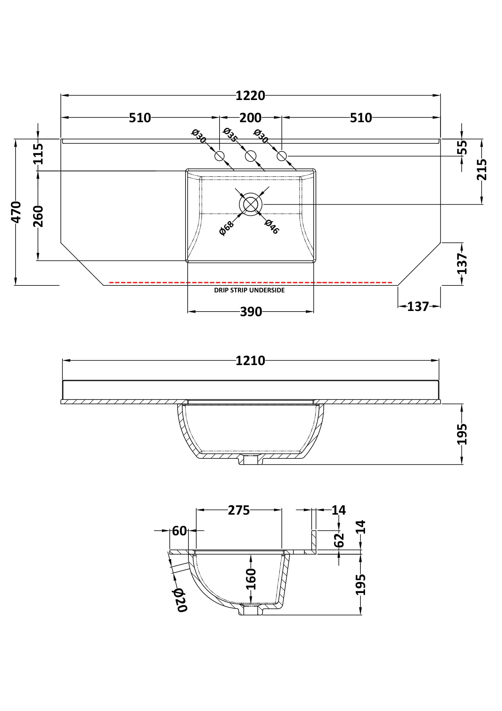1200mm Single Bowl Angled Marble Top - 3 Tap Hole