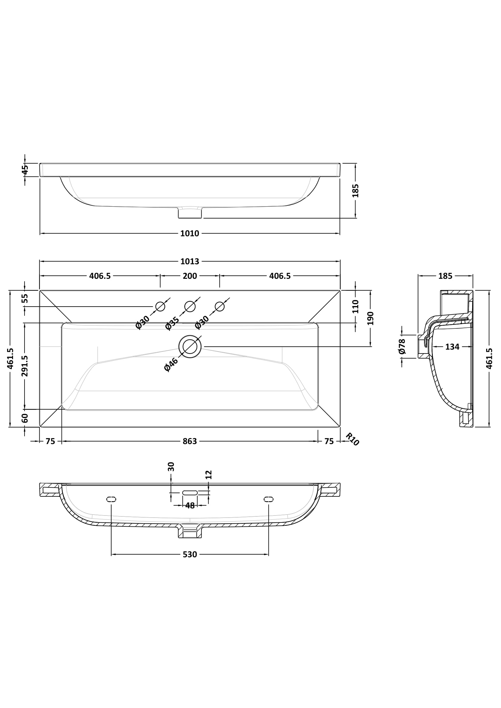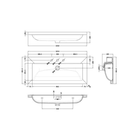 3 Tap Hole Minimalist Basin - 1010 x 460