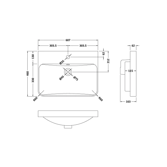 600 x 460 Curved Tap Holein-Edged Basin - 1 Tap Hole