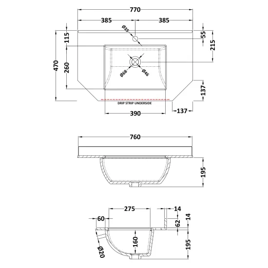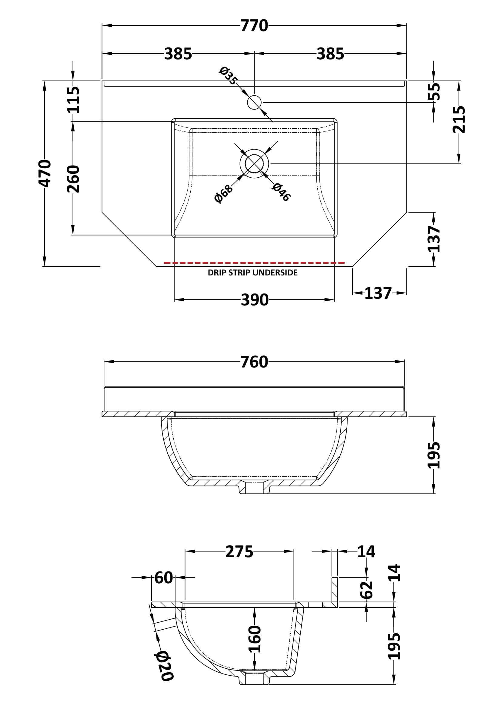 750mm Single Bowl Angled Marble Top - 1 Tap Hole