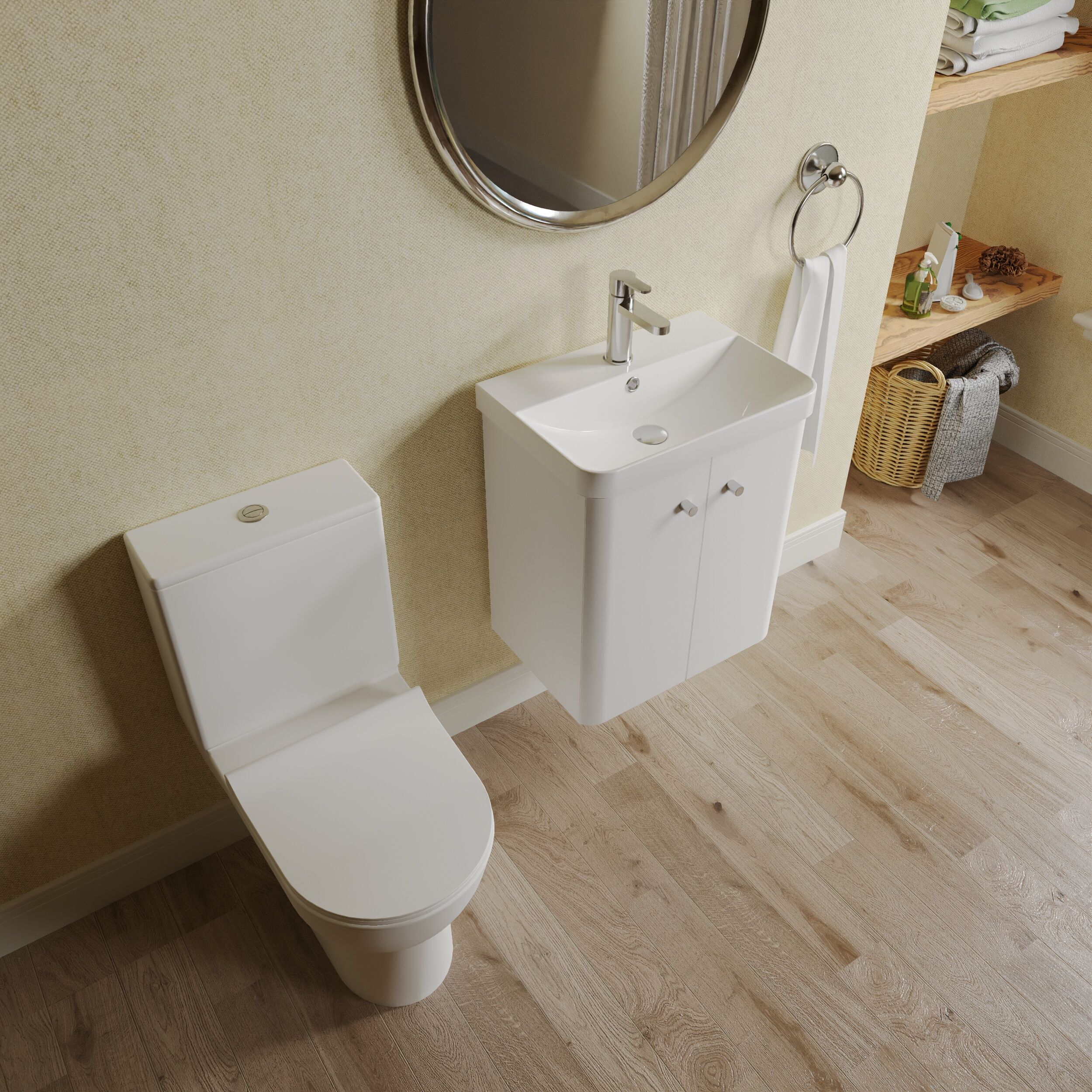 Supplied with high quality china basin, rimless pan, cistern and soft close seat