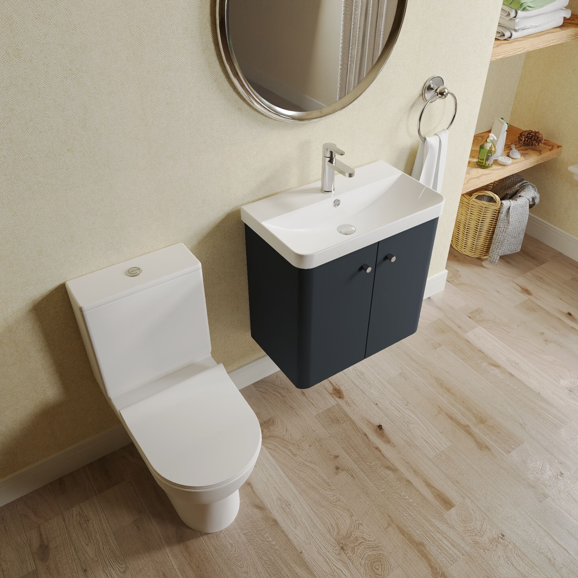 Supplied with high quality china basin, rimless pan, cistern and soft close seat