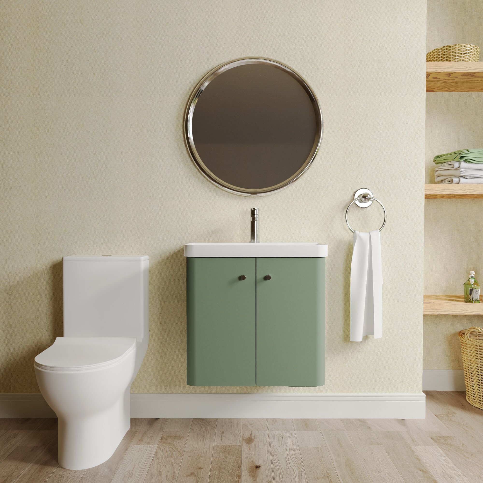 Nuie Core 600mm Satin Green Wall Hung Vanity & Toilet Unit With Soft Close Seat, Tap & Waste