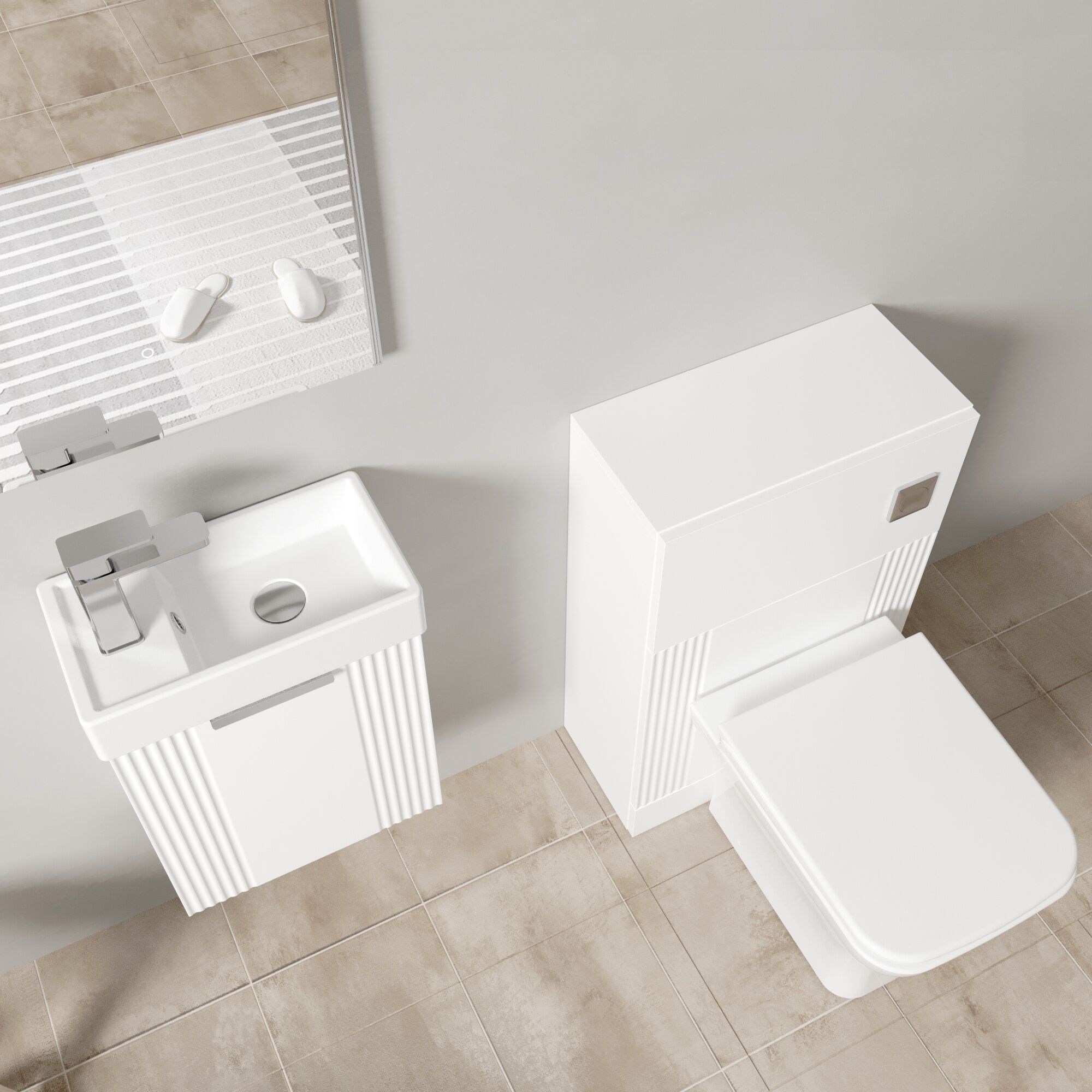 Contemporary part fluted art deco design features on both the vanity and WC unit