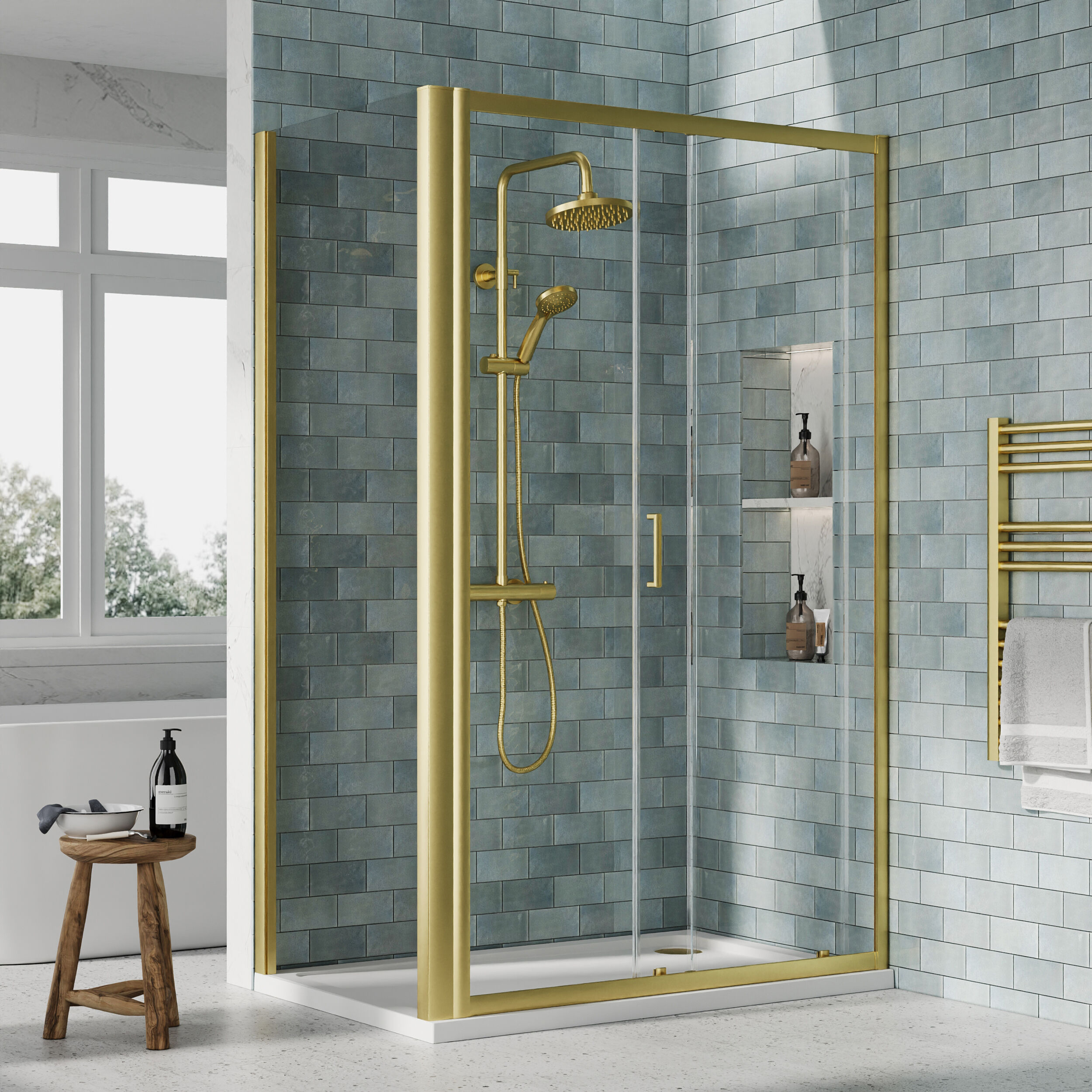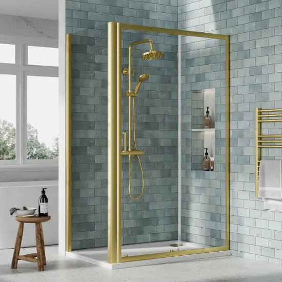 Nuie 1200x760mm Brushed Brass Rectangular Sliding Door Shower Enclosure With Tray