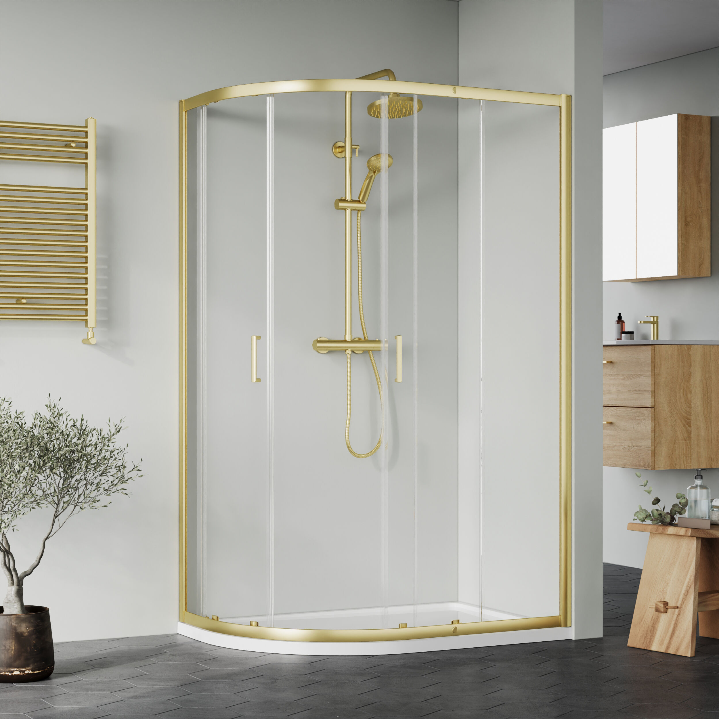 Nuie 1200x800mm Right Hand Offset Quadrant Brushed Brass Frame Shower Enclosure With Tray