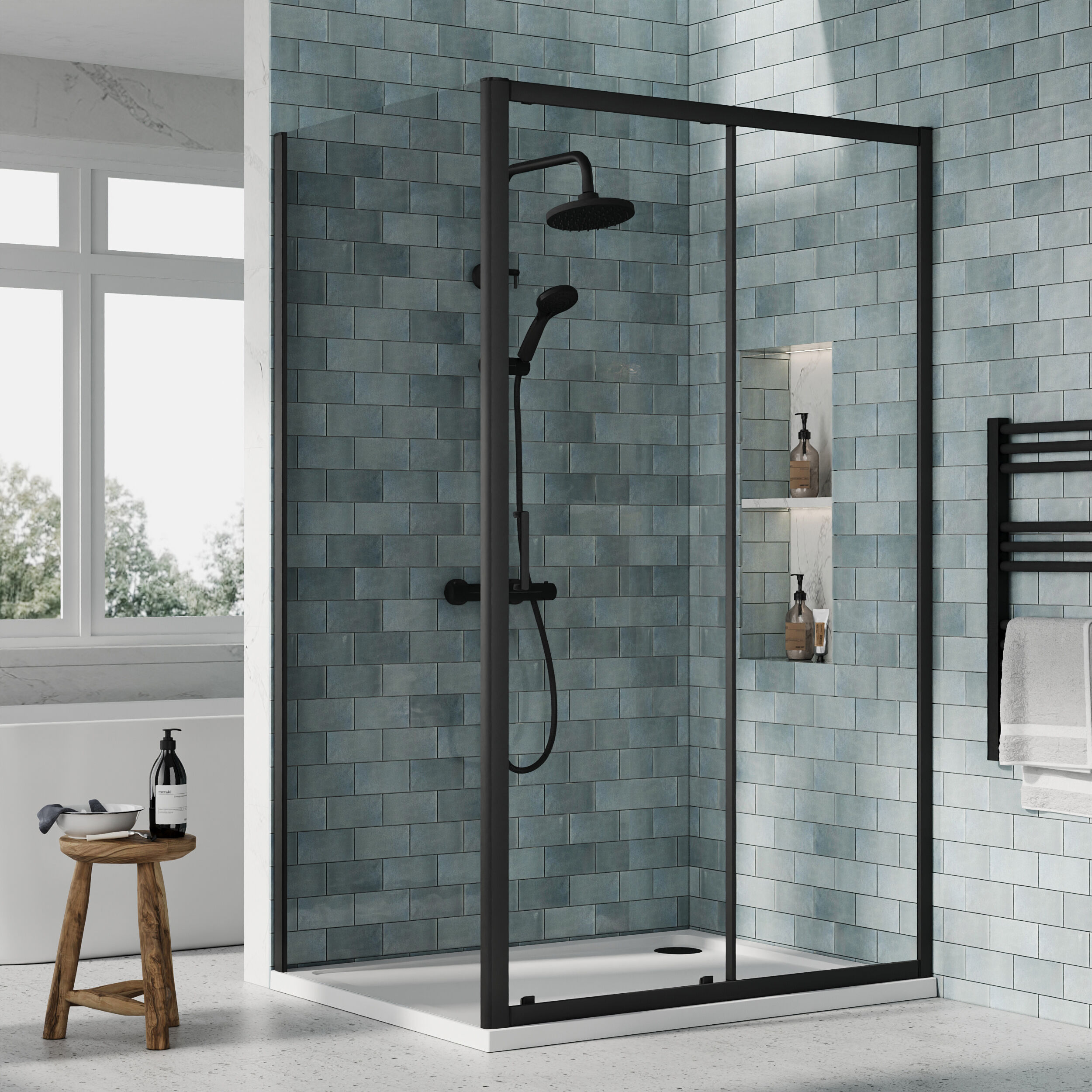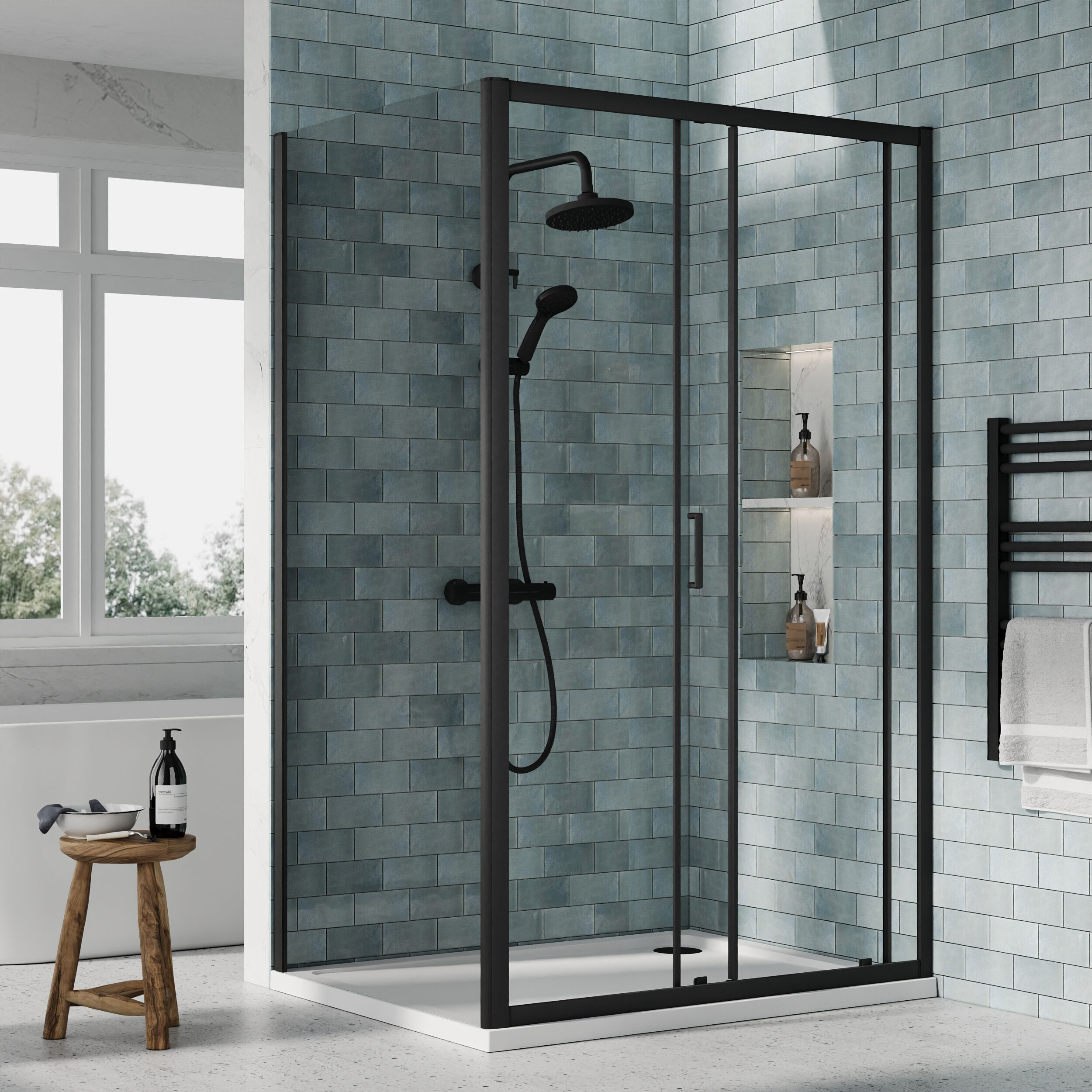 Nuie 1200x900x1900mm Matt Black Sliding Door Shower Enclosure With Tray