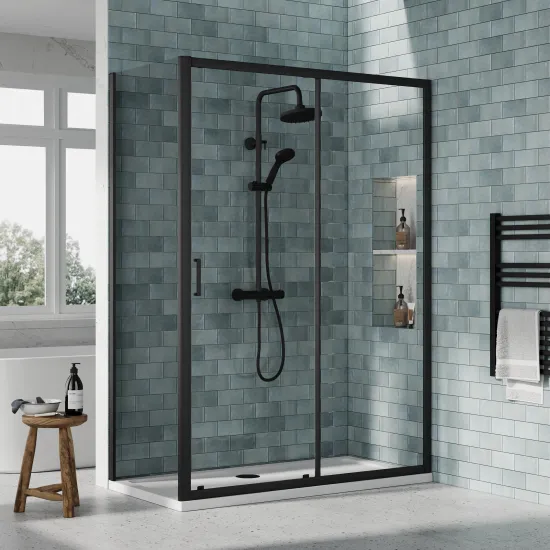 Nuie 1400 x 700mm Matt Black Rectangular Sliding Shower Enclosure Including Tray