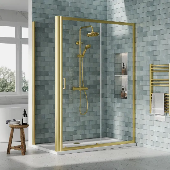 Nuie 1400x760x1900mm Brushed Brass Rectangular Sliding Door Shower Enclosure With Tray