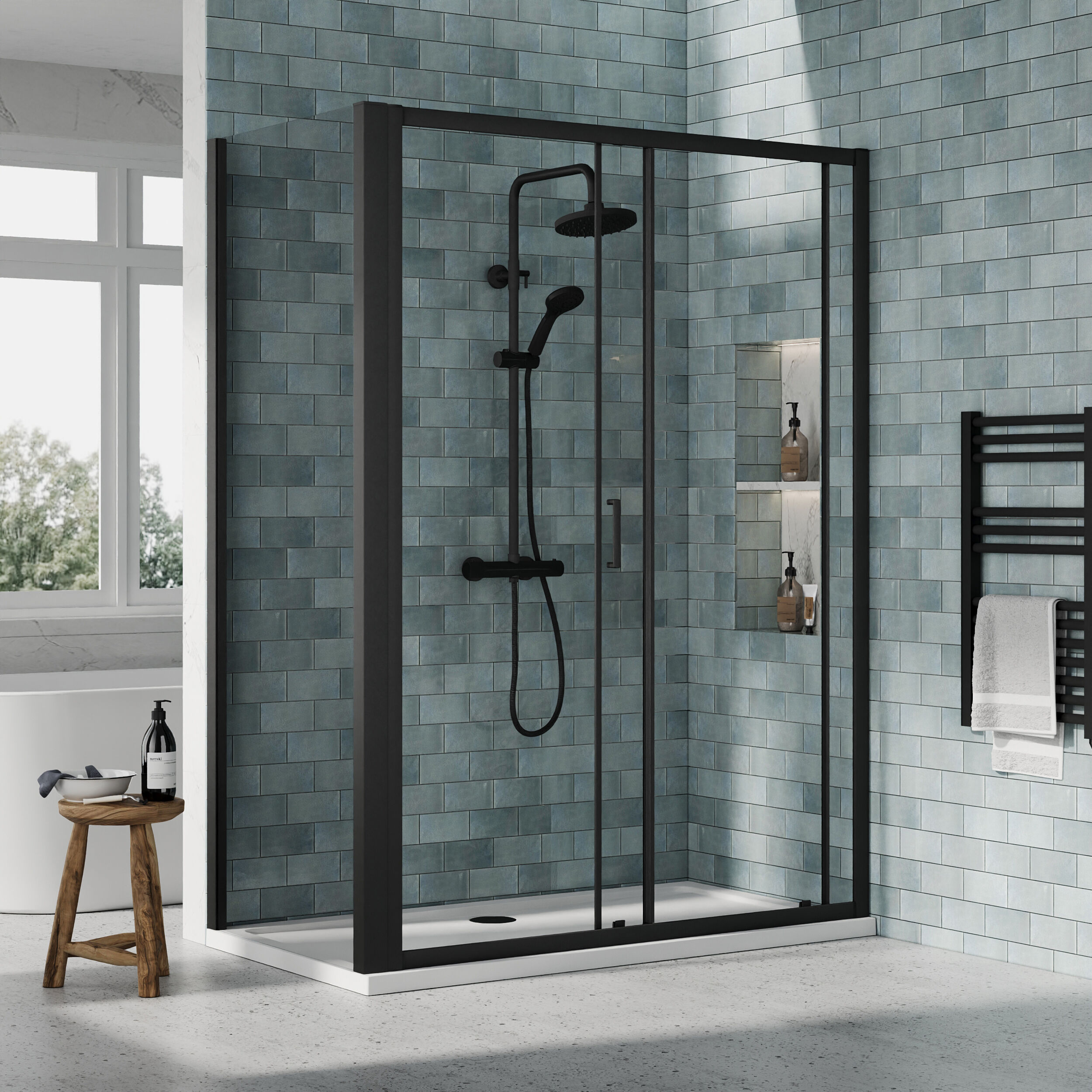 Nuie 1400x760mm Matt Black Sliding Shower Enclosure Including Tray