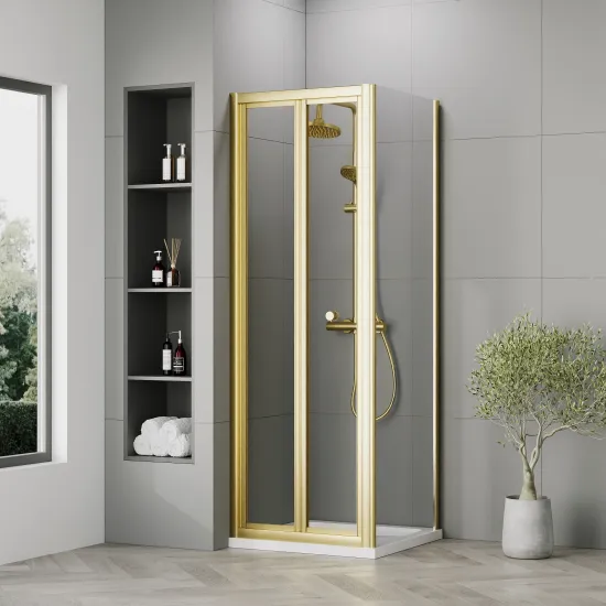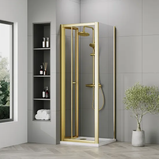 Nuie 700x700mm Brushed Brass Bi-Fold Shower Enclosure With Side Panel & Tray