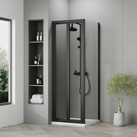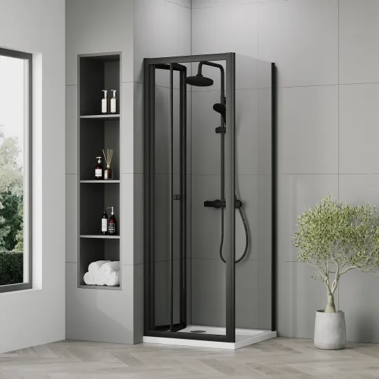 Nuie 700x700x1900 Matt Black Bi-Fold Shower Enclosure With Side Panel & Tray