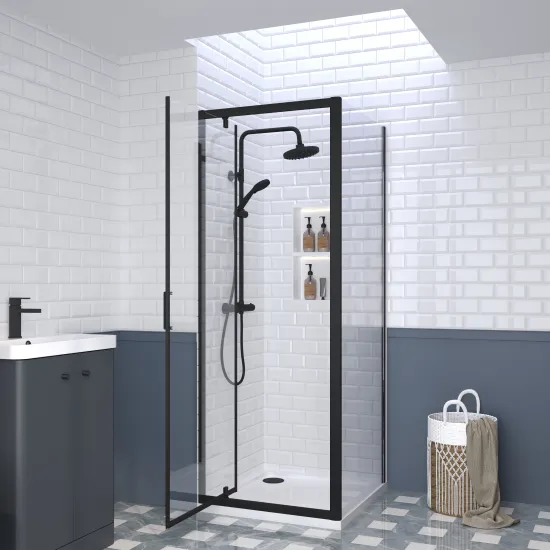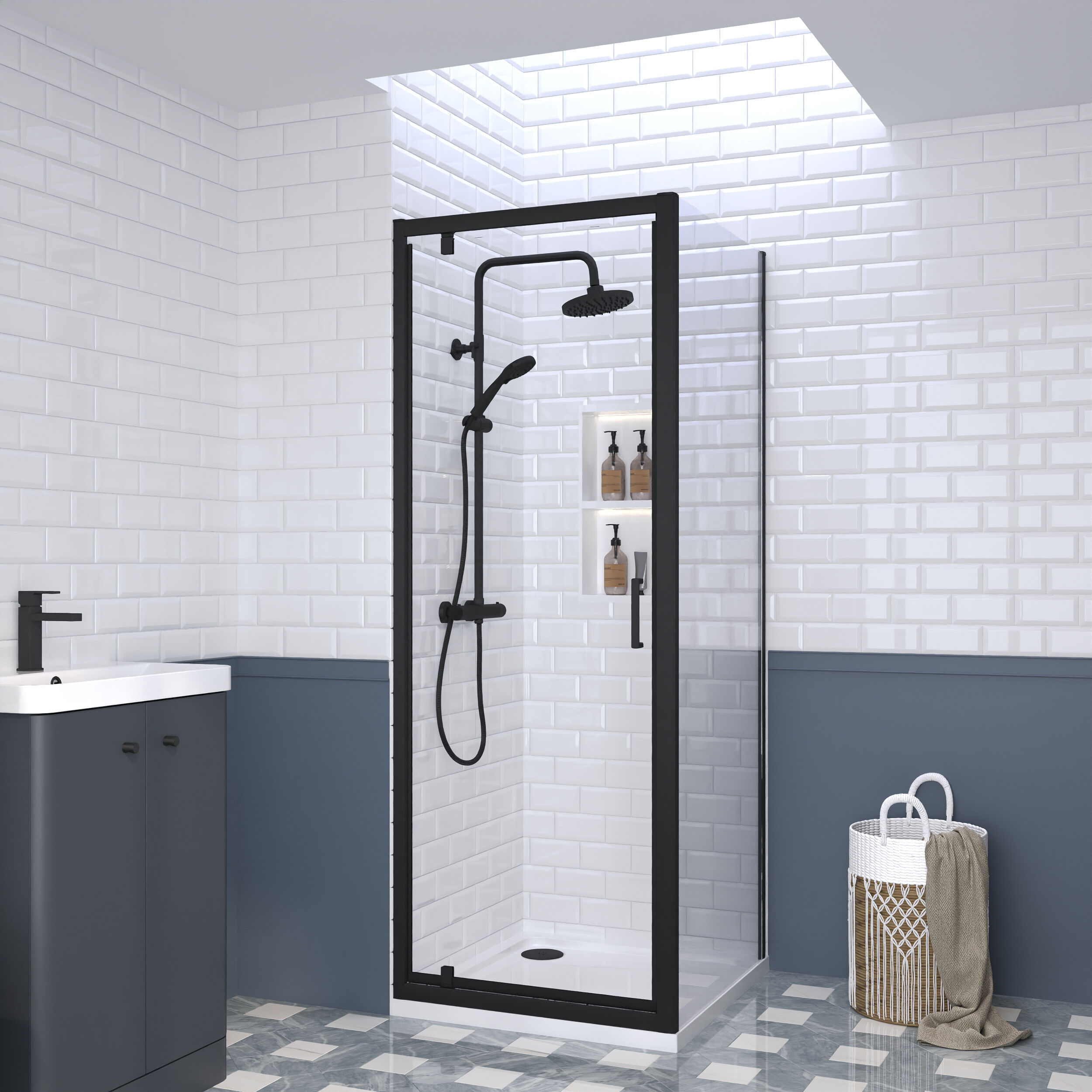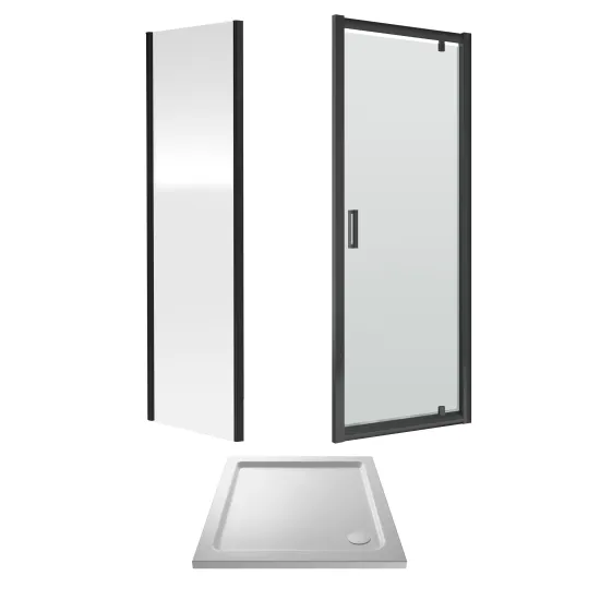 Nuie 760x760mm Matt Black Square Pivot Door Shower Enclosure With Tray & Side Panel