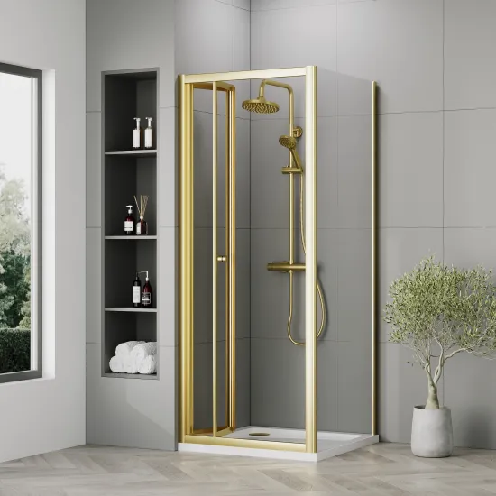Nuie 800x800 Brushed Brass Bi-Fold Shower Enclosure With Side Panel & Tray