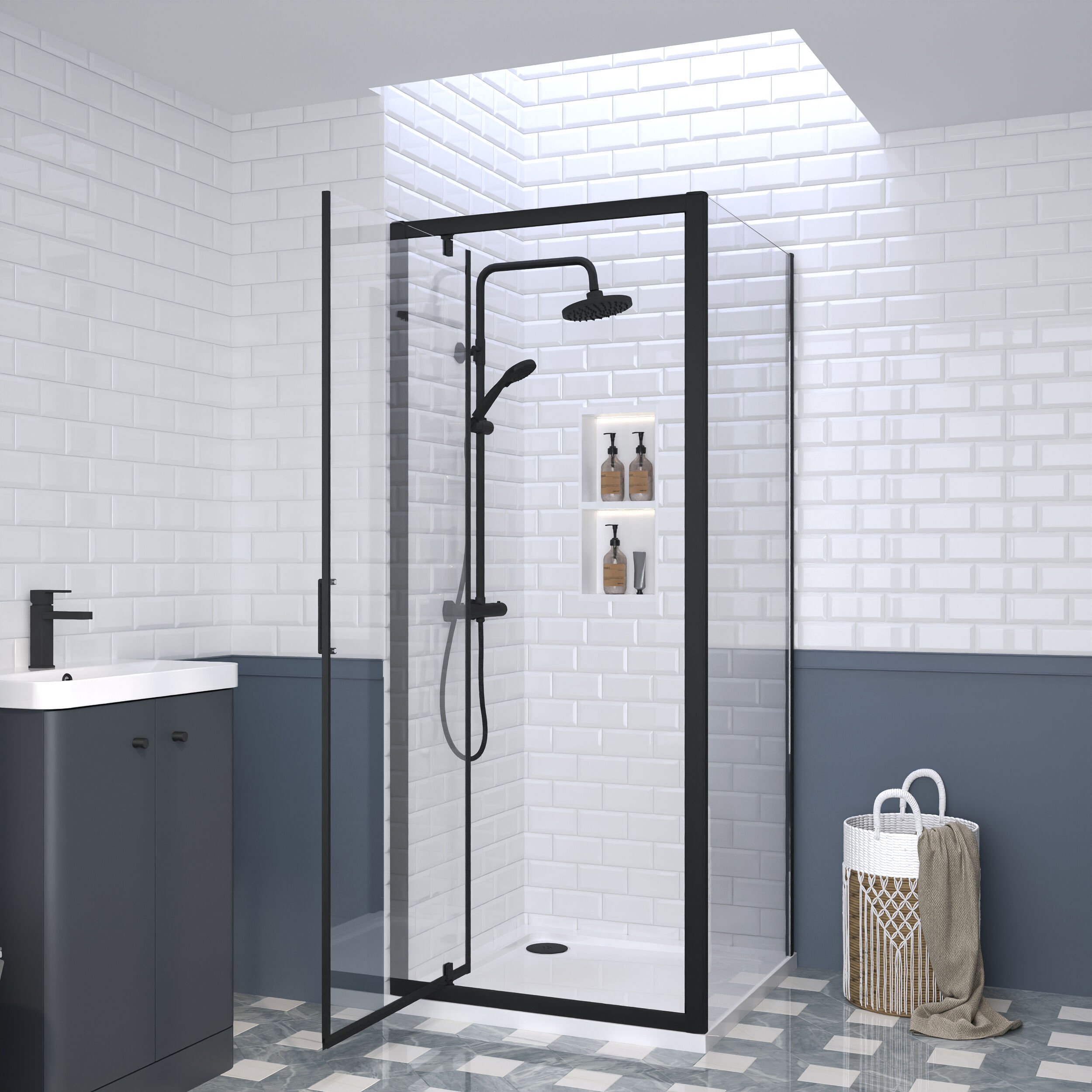 Nuie 800x800mm Matt Black Square Pivot Shower Enclosure With Side Panel & Tray