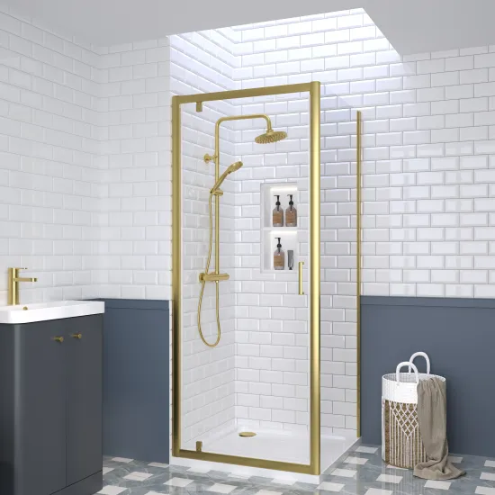 Nuie 900x900x1900mm Brushed Brass Pivot Door Shower Enclosure Including Tray and Side Panel