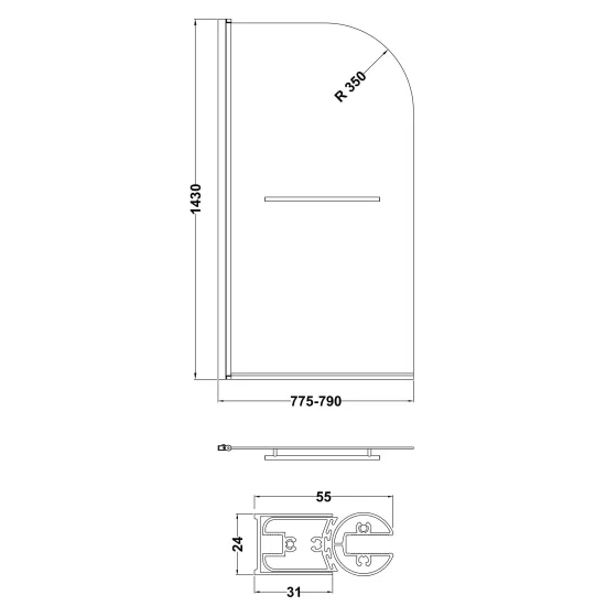 Nuie 790mm Semi-Frameless Chrome Bath Screen With Rail