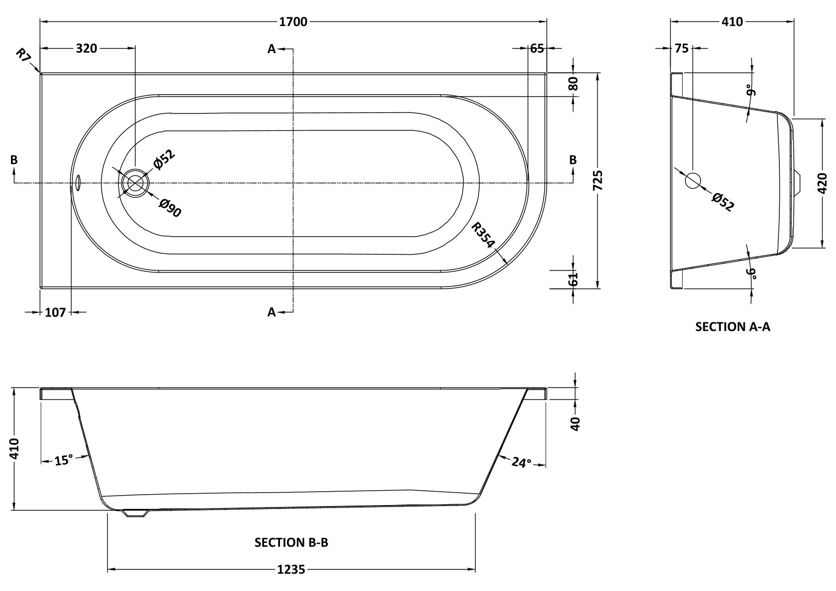 Nuie Left Hand Back to Wall 1700mm x 725mm Corner Bath With Adjustable Legs and Panel