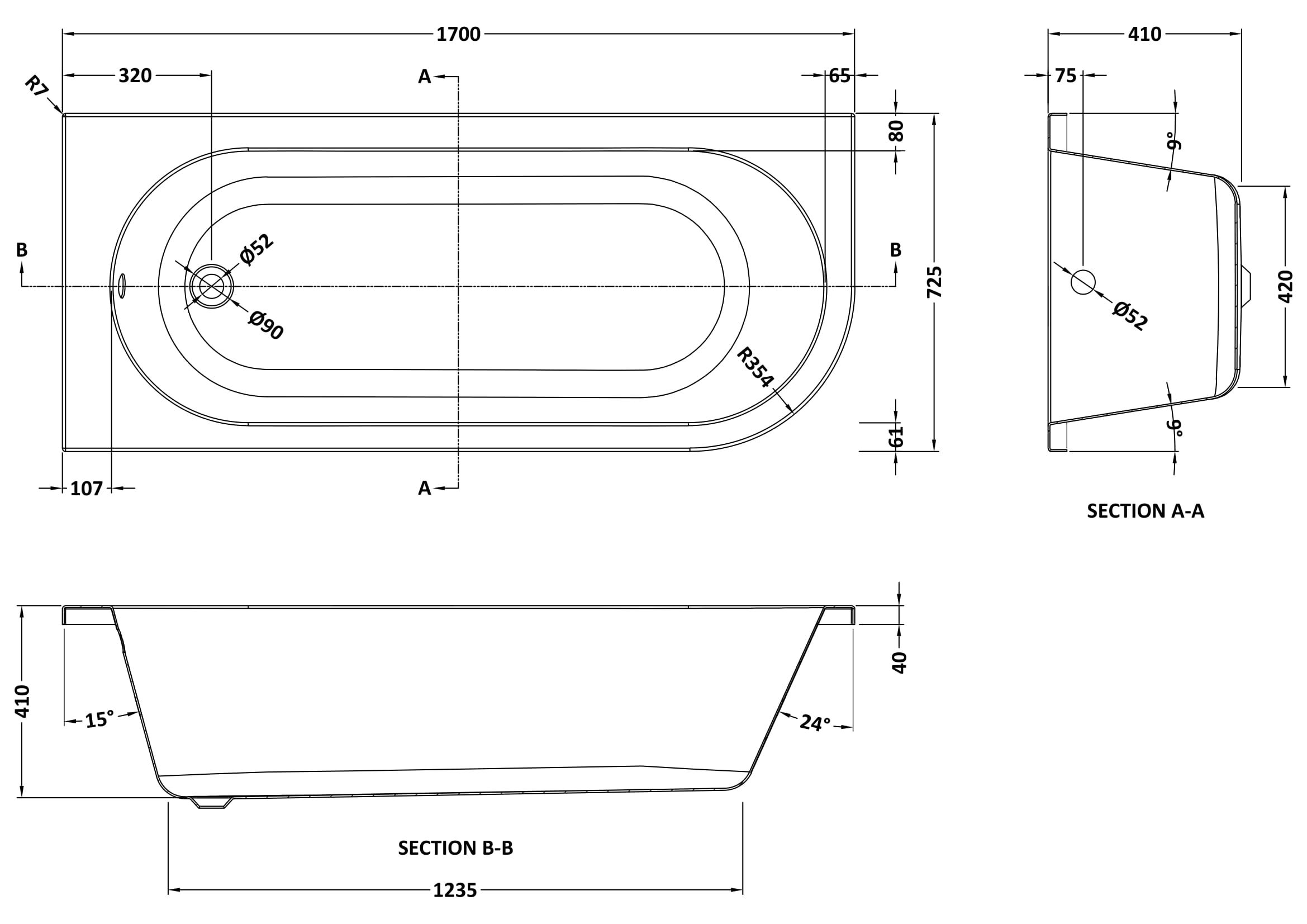 Nuie 1700mm Left-Hand Curved Bath With Legs And Panel