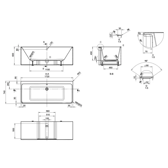 Murali Square Back To Wall Bath 1720mm x 740mm