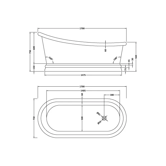 1700mm Slipper Bath - Copper Outer/Nickel Inner