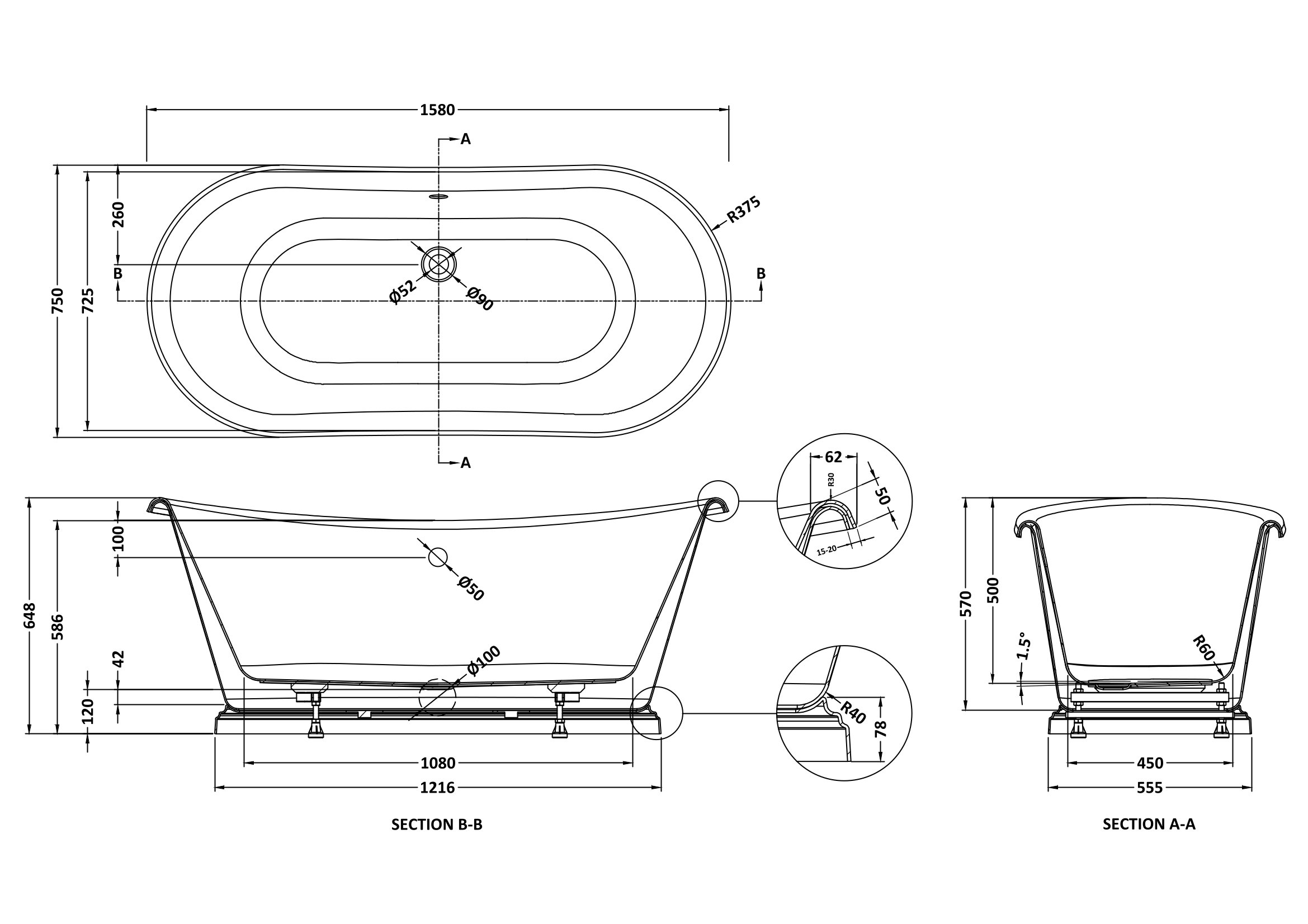BC Designs Megane 1580mm Boat Freestanding Bath