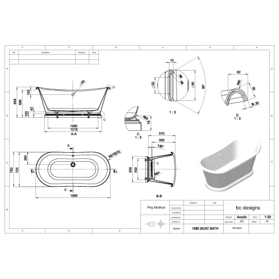BC Designs Boat Freestanding Double Ended Acrylic Boat Bath with Aluminium Plinth - 1580mm - White