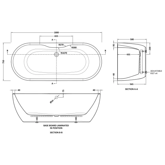 Myriad Curved BTW Freestanding Bath 1500 x 750 x 575