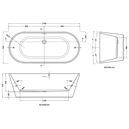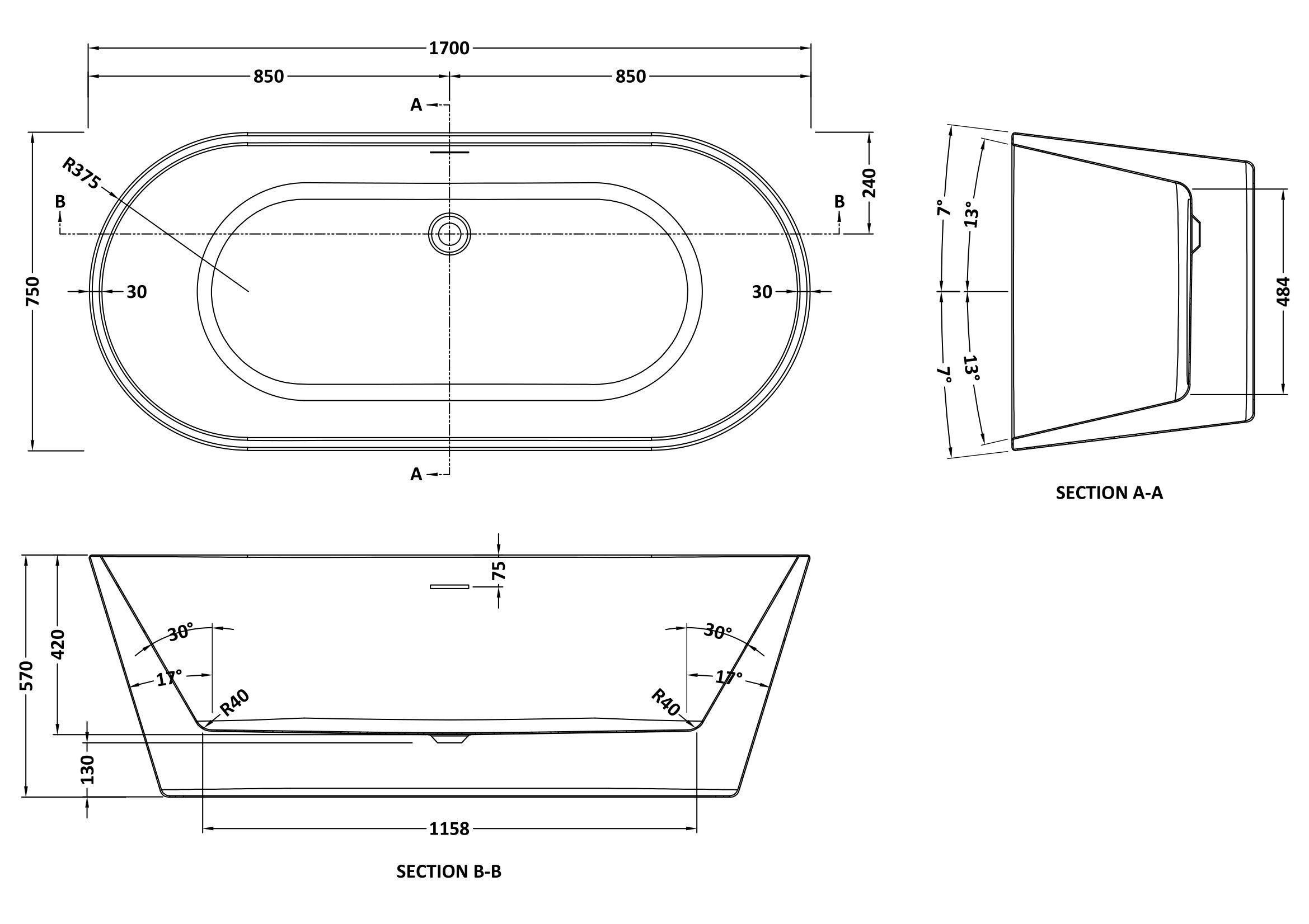 nuie Freestanding Double Ended Oval Bath Tub, 1700mm x 750mm - White