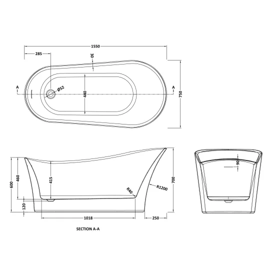 Freestanding Single Ended Slipper Bath Tub, 1550mm x 750mm