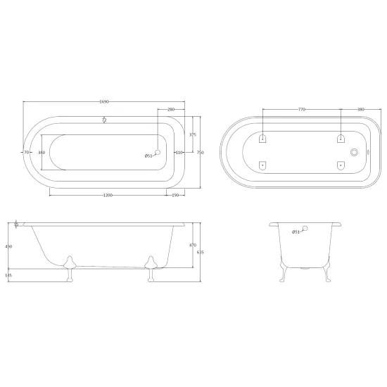 Mistley Single Ended Roll Top Bath With Feet Set 1 - 1700mm
