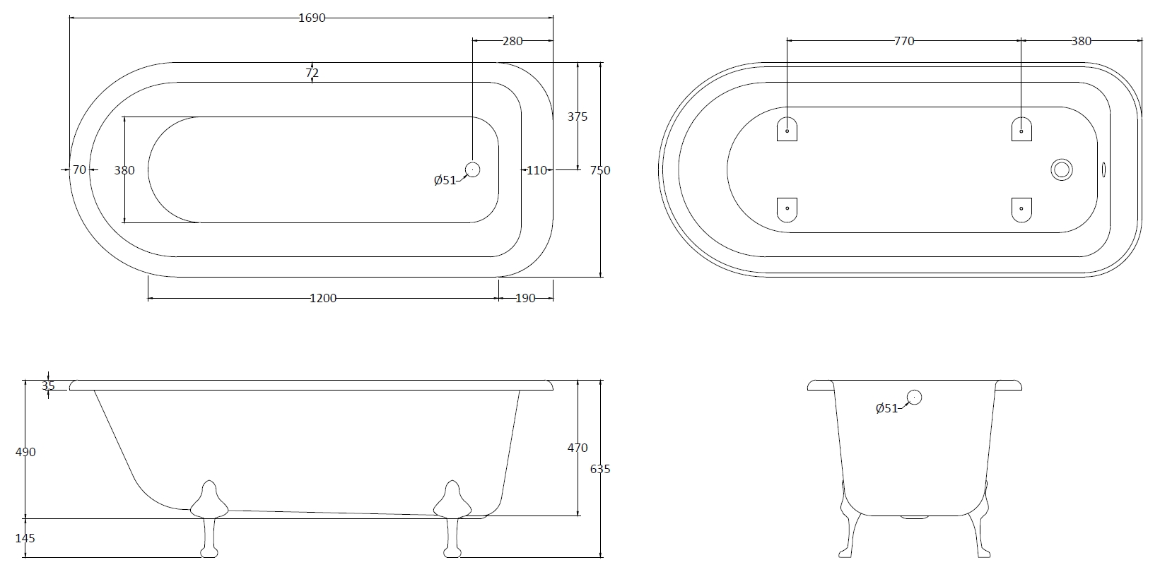 Mistley Single Ended Roll Top Bath With Feet Set 1 - 1700mm