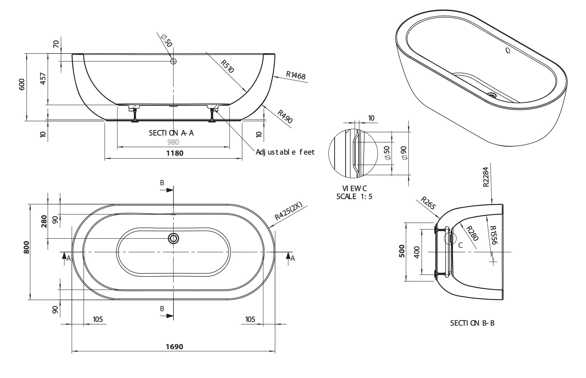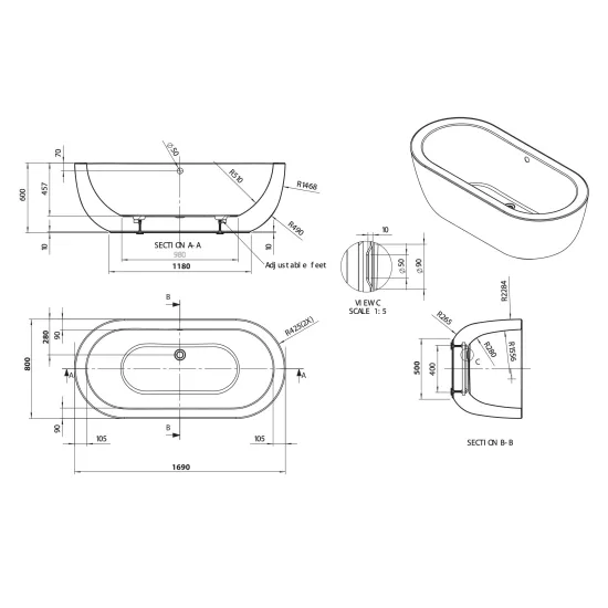 Ovali Freestanding Oval with Waste 1690mm x 800mm