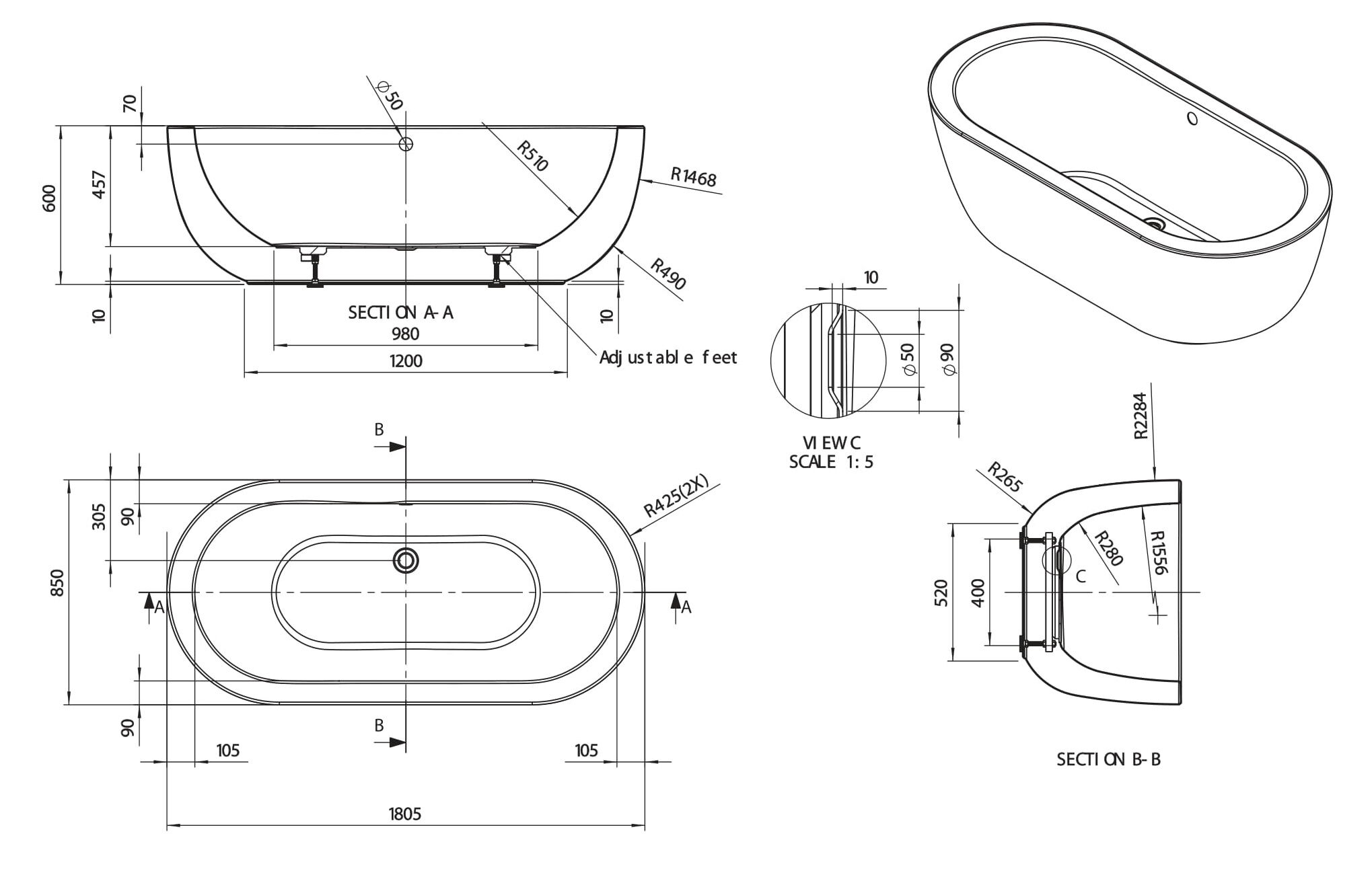 BC Designs Ovali 1805mm Freestanding Bath With Waste