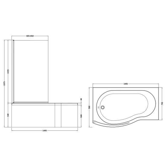 Nuie 1500mm Right Hand P-Shaped Shower Bath Including Curved Screen & Side Panel