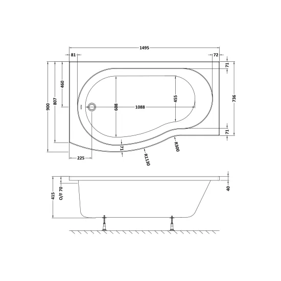 Nuie 1495mm Right-Hand B Shaped Shower Bath With Legs