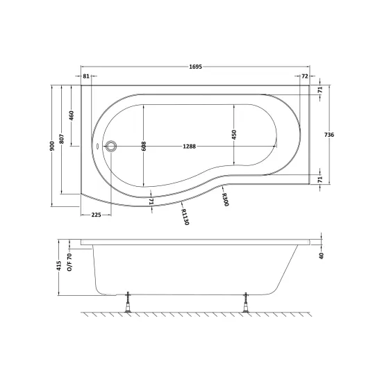 Nuie 1695mm Left-Hand B Shaped Shower Bath With Legs
