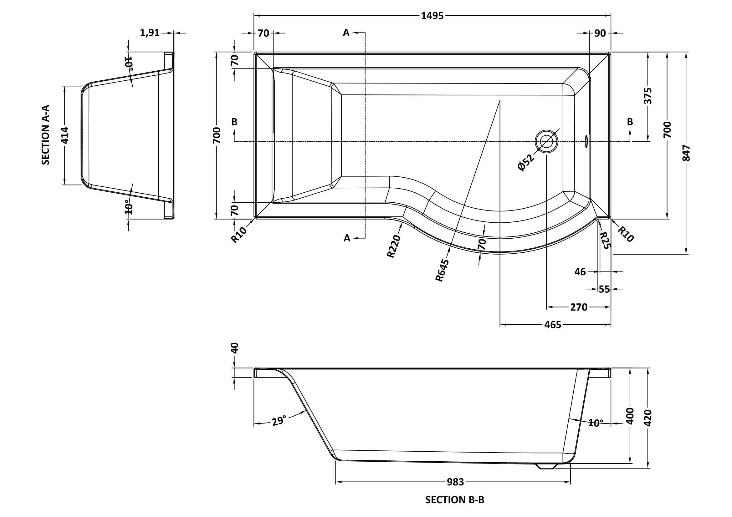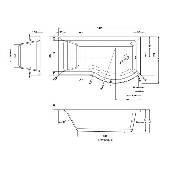 This P-shaped bath features soft, rounded edges designed for enhanced comfort and is constructed from durable 5mm white acrylic
