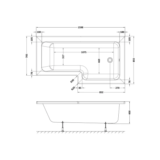 Nuie 1600mm Left-Hand P Shaped Shower Bath With Legs