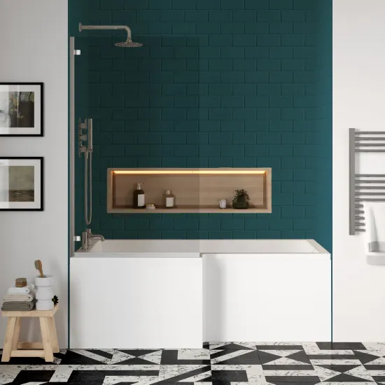Nuie 1700mm x 850mm White Left Hand L-Shaped Shower Bath With Screen & Panel