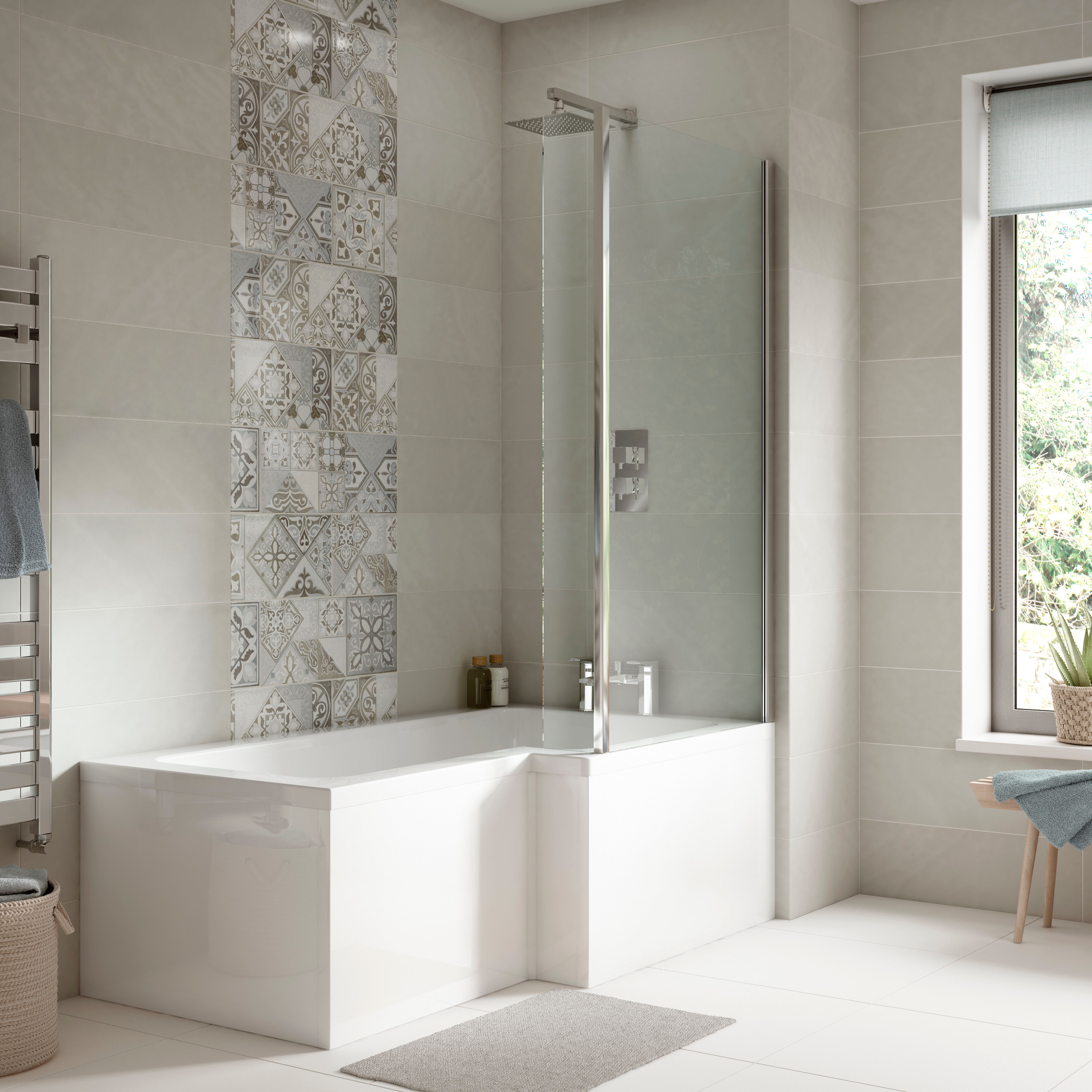 Nuie 1700mm Left Hand B-Shaped Shower Bath With Screen, Side Panel & Leg Set