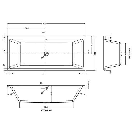 Asselby Square Thin Edge Double Ended Straight Shower Bath 1800mm x 800mm