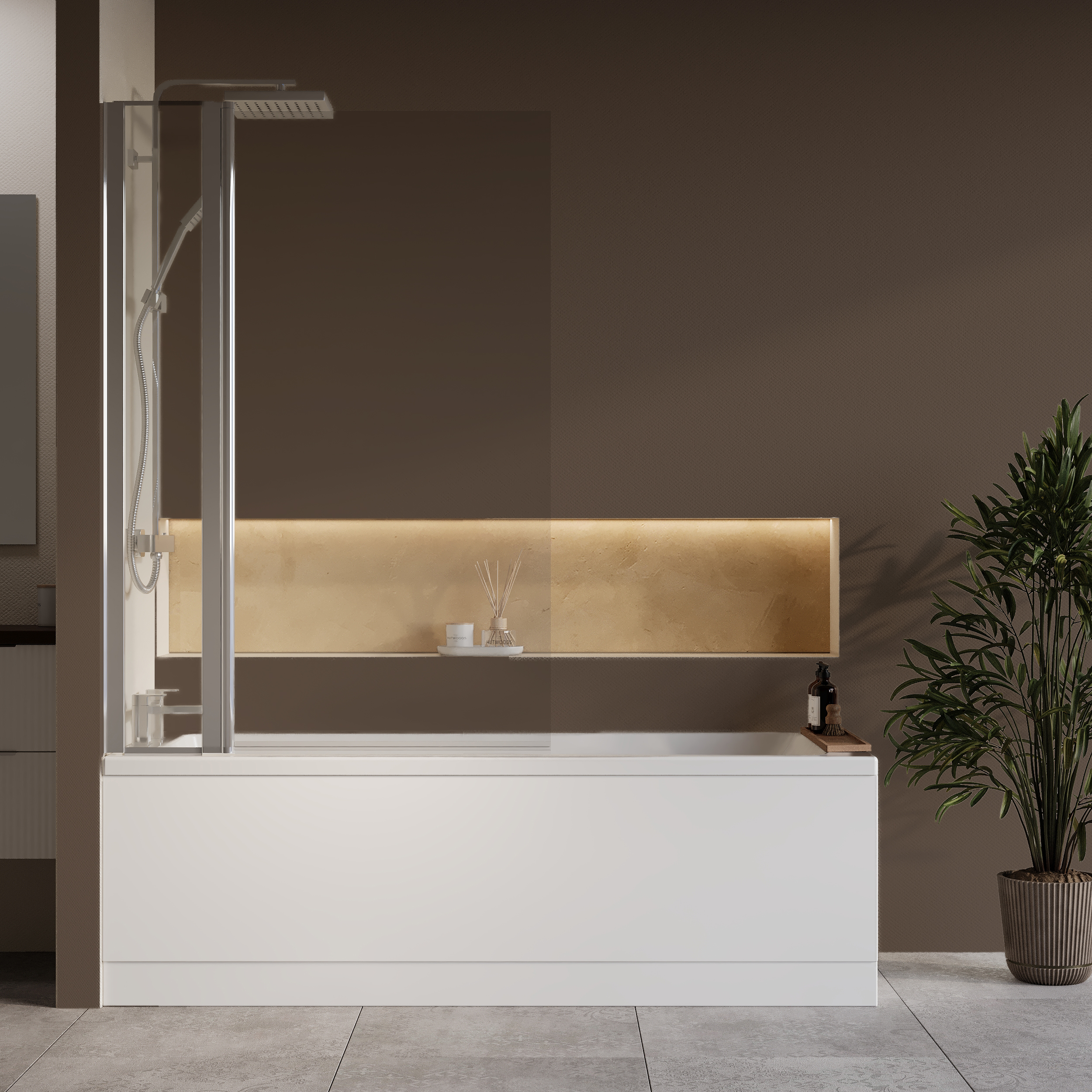 Square single ended bath, bath screen & gloss white acrylic side panel