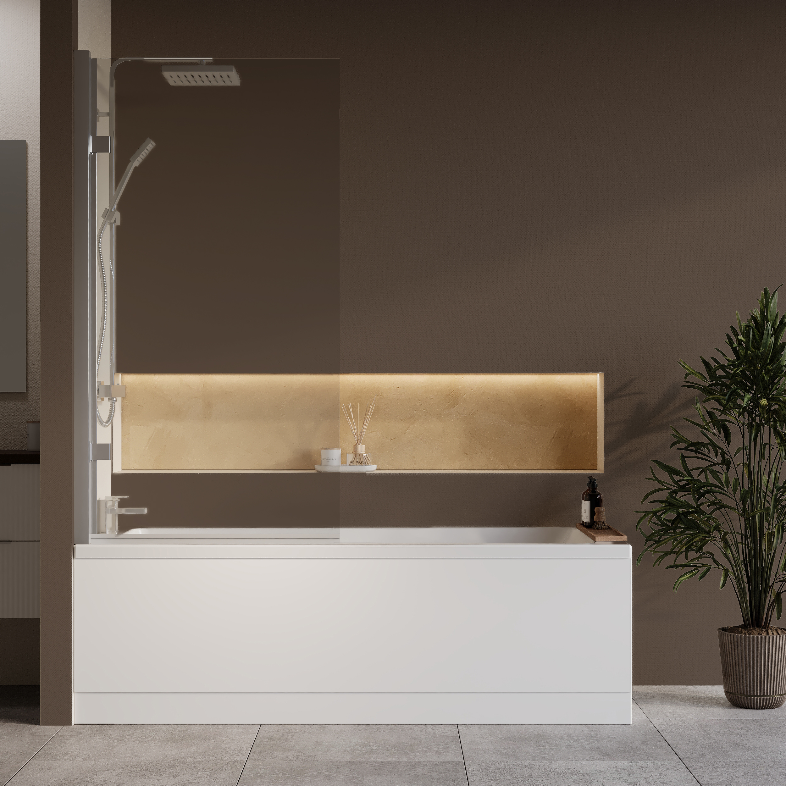 Square single ended bath, bath screen & gloss white acrylic side panel