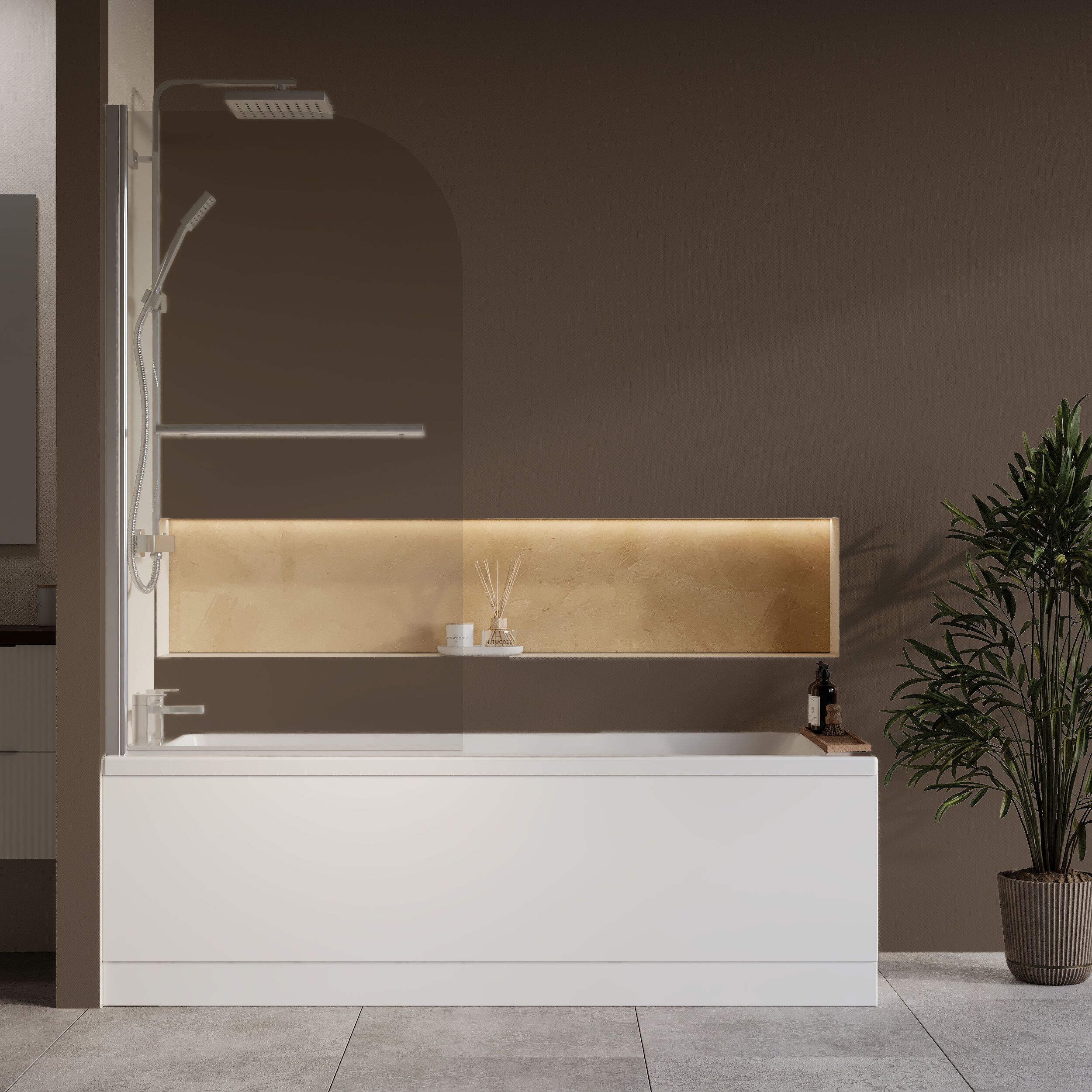 Square single ended bath, bath screen & gloss white acrylic side panel