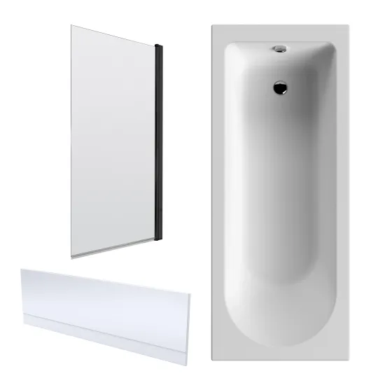 Round single ended bath, bath screen & gloss white acrylic side panel
