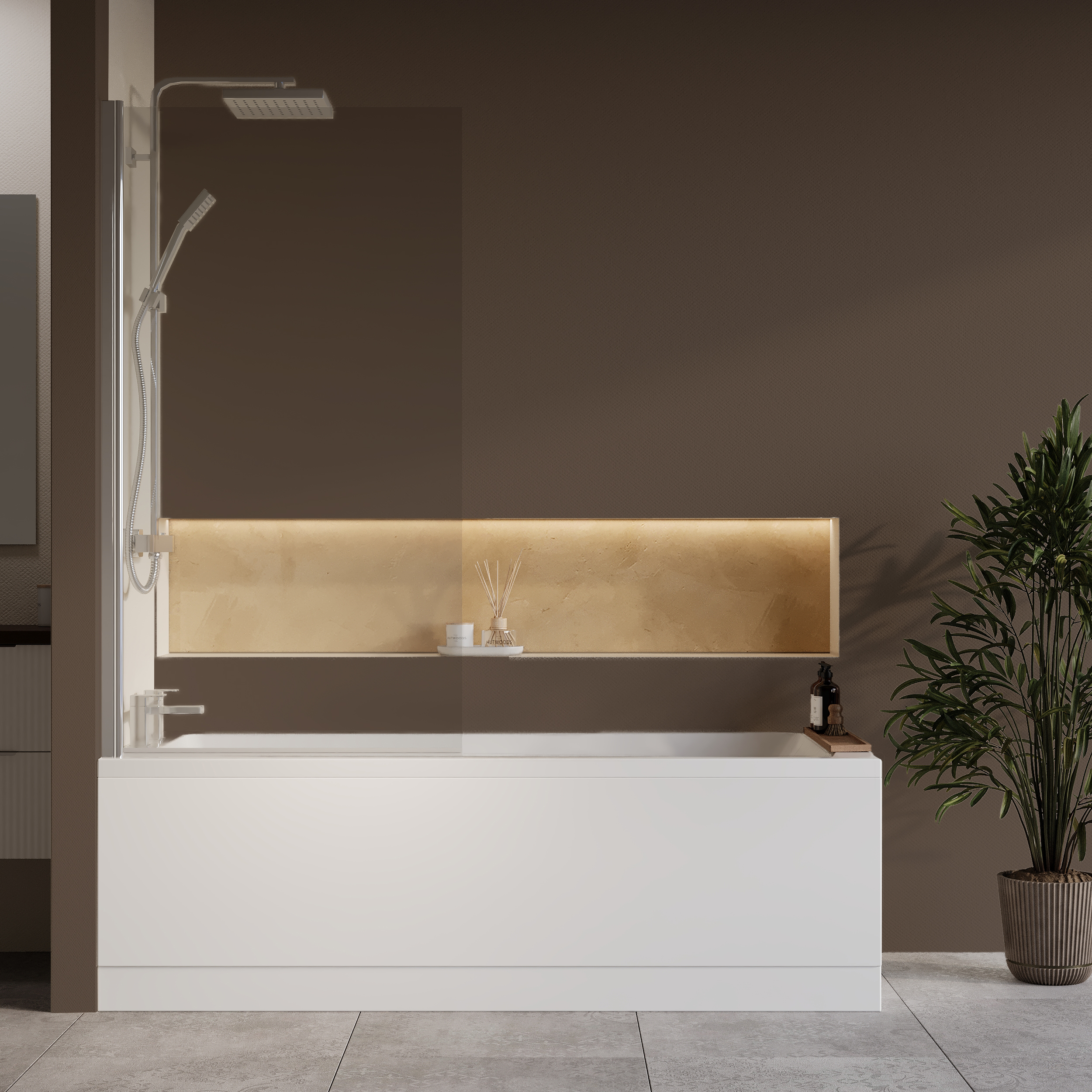 Square single ended bath, bath screen & gloss white acrylic side panel