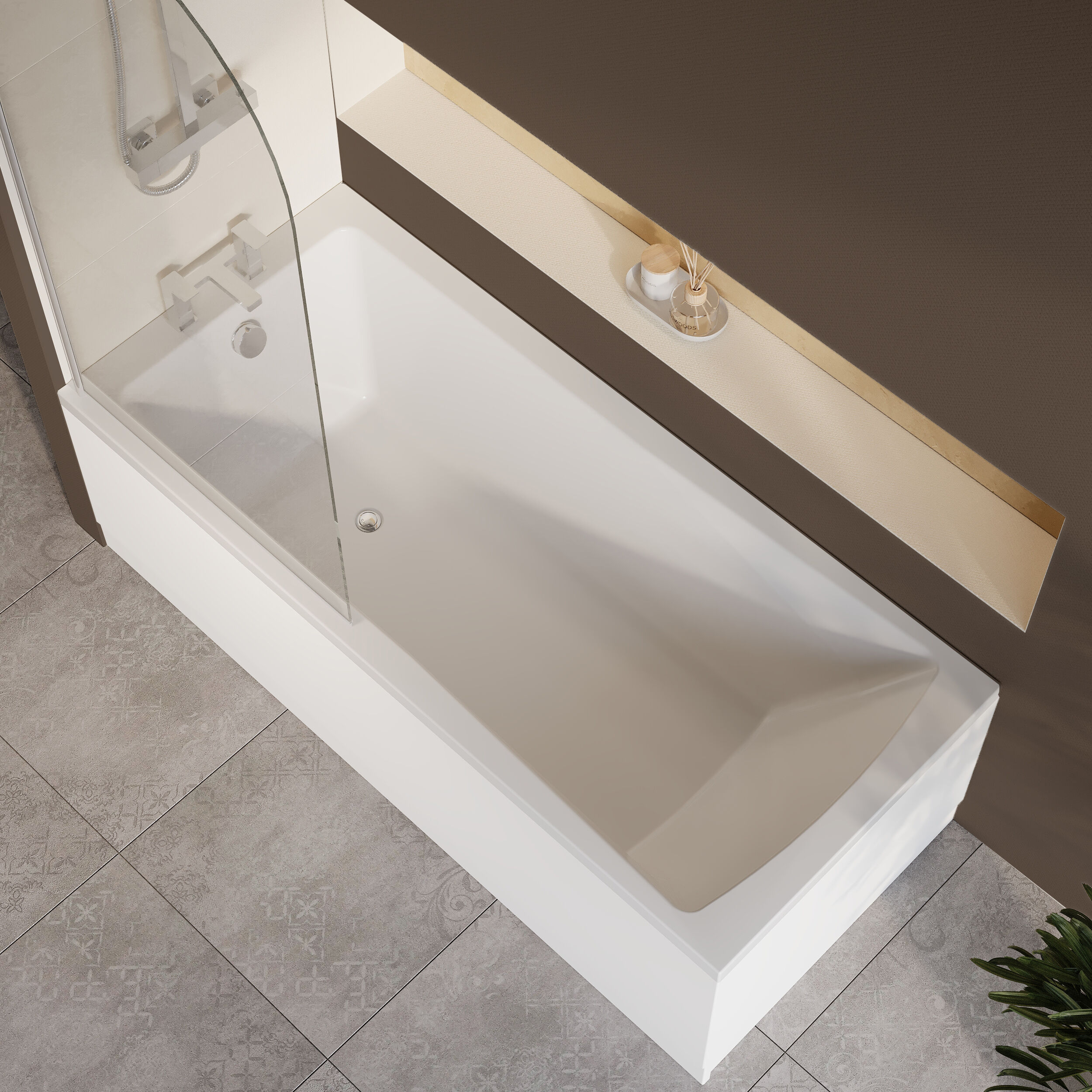 Square single ended bath, bath screen & gloss white acrylic side panel